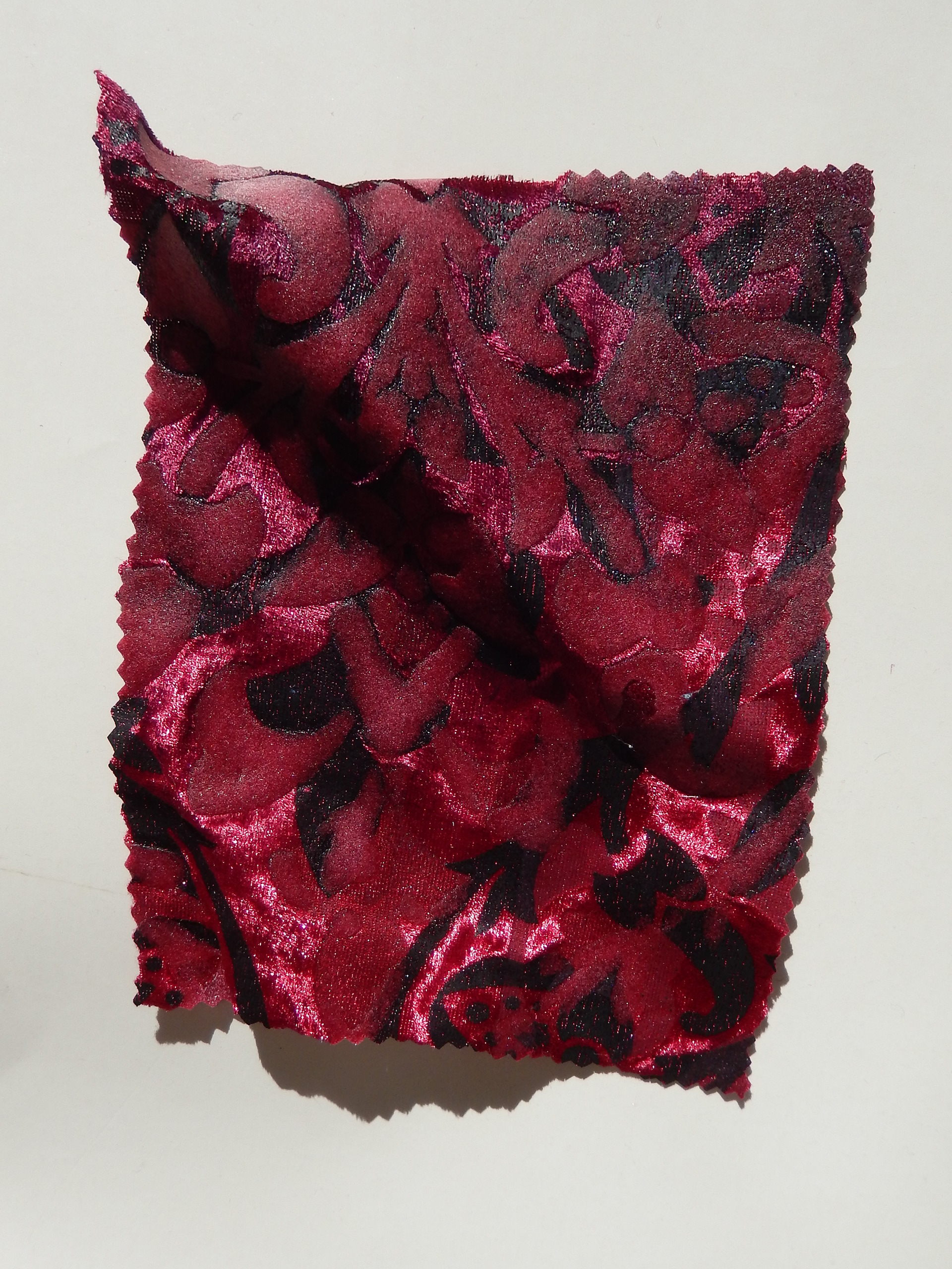 Techniques et matériaux : Sérigraphie en relief, enductions et micro billes de verres sur velour synthétique