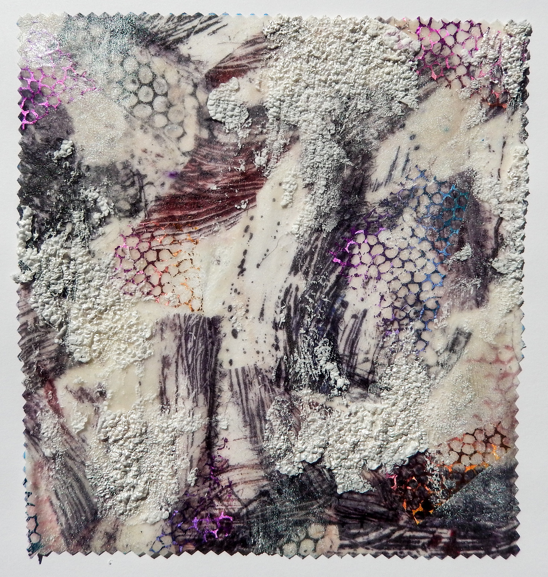 Techniques et matériaux : applications direct d'enductions, sublimation et dorures sur organza de soie
