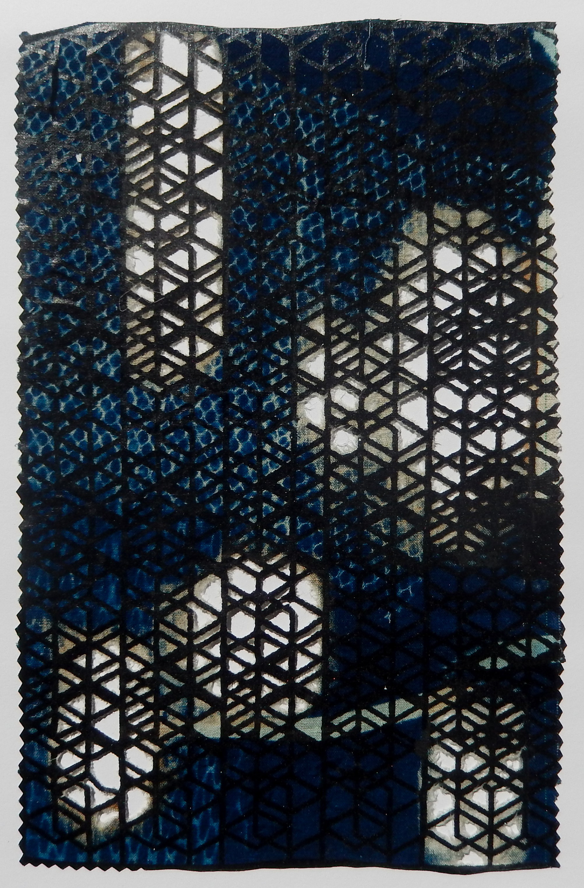 Techniques et matériaux : Dévoré, sérigraphie et cyanotype sur lin coton