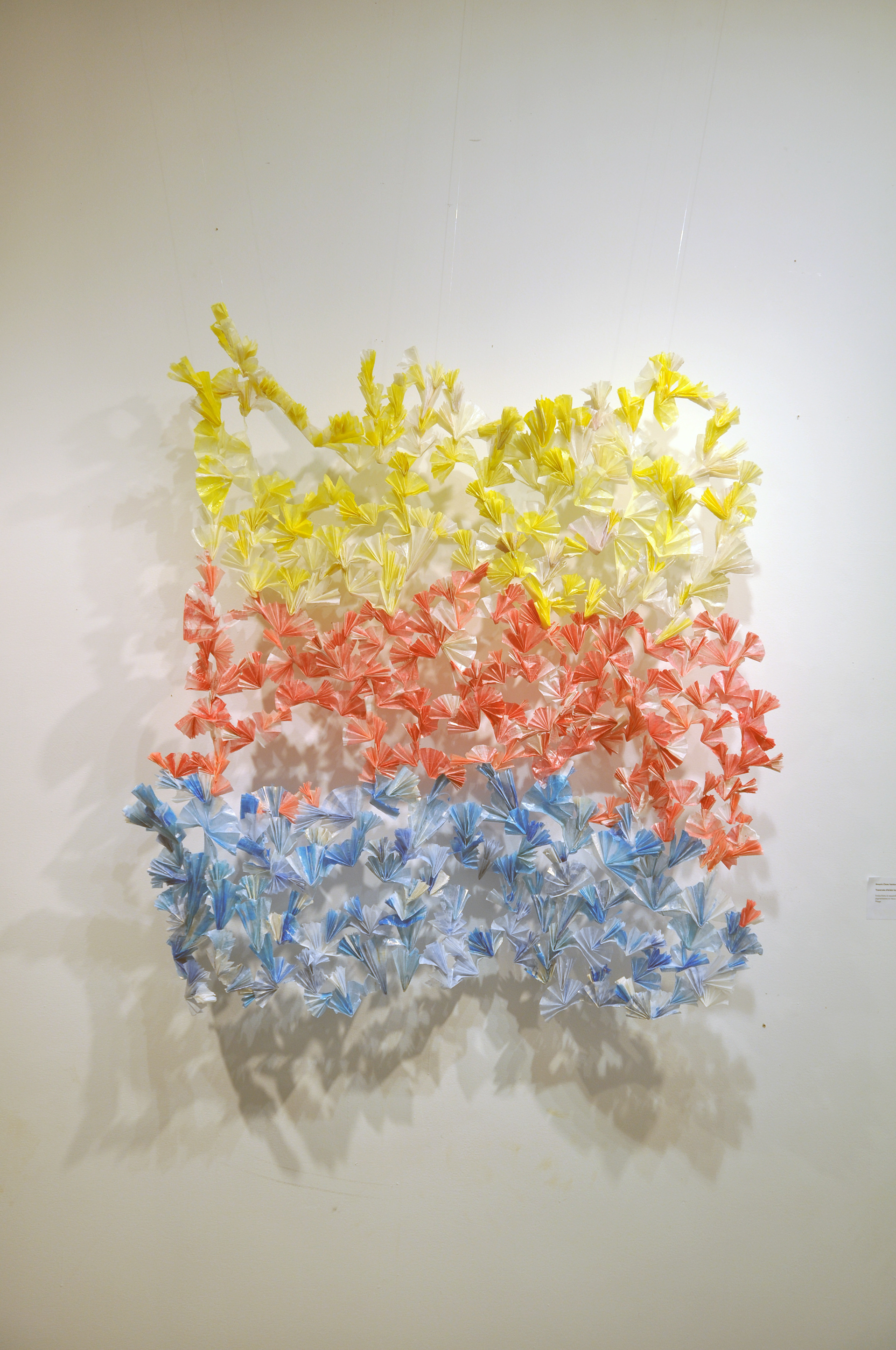 Techniques et matériaux : Papiers textiles, pliage, collage, enduction textile, sérigraphie et colorants pigments teintures et aquarelles pigments mica.